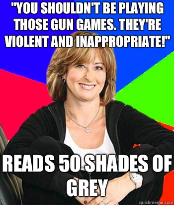 "you shouldn't be playing those gun games. They're violent and inappropriate!" Reads 50 shades of grey