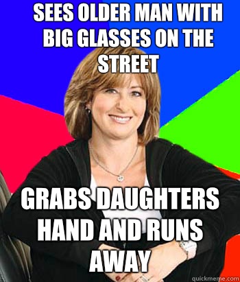 Sees older man with big glasses on the street Grabs daughters hand and runs away