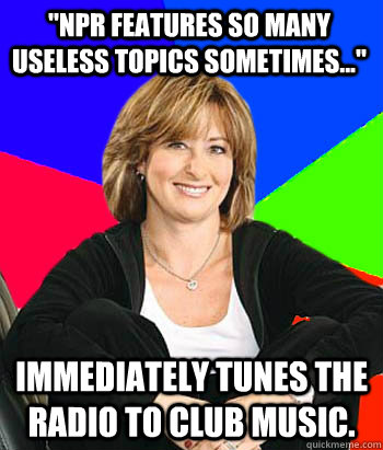 "NPR features so many useless topics sometimes..." Immediately tunes the radio to club music.