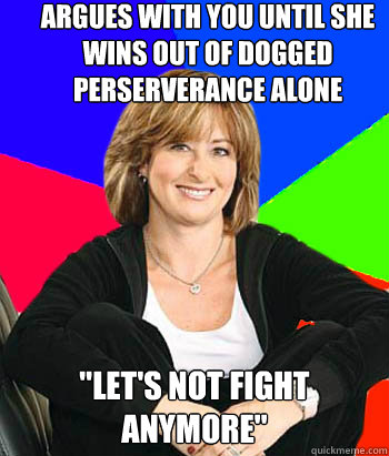 argues with you until she wins out of dogged perserverance alone "let's not fight anymore"