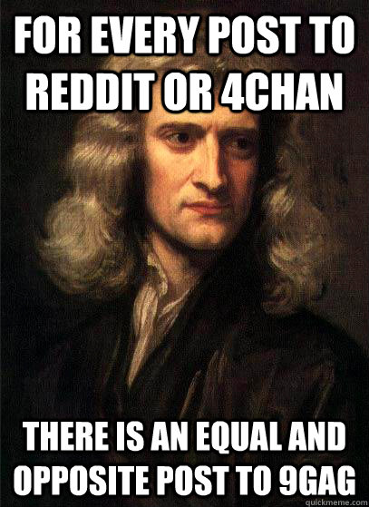 For every post to reddit or 4chan there is an equal and opposite post to 9gag