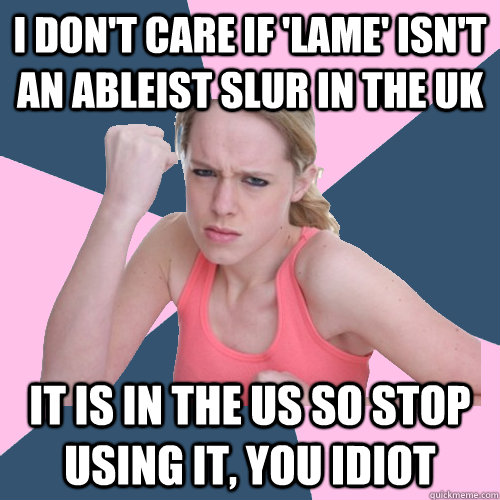I don't care if 'lame' isn't an ableist slur in the UK It is in the US so stop using it, you idiot
