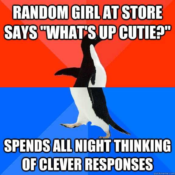 Random girl at store says "What's up cutie?" Spends all night thinking of clever responses