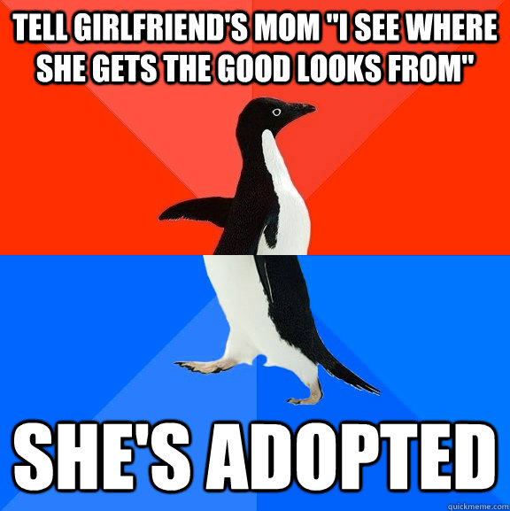 tell girlfriend's mom "i see where she gets the good looks from" she's adopted