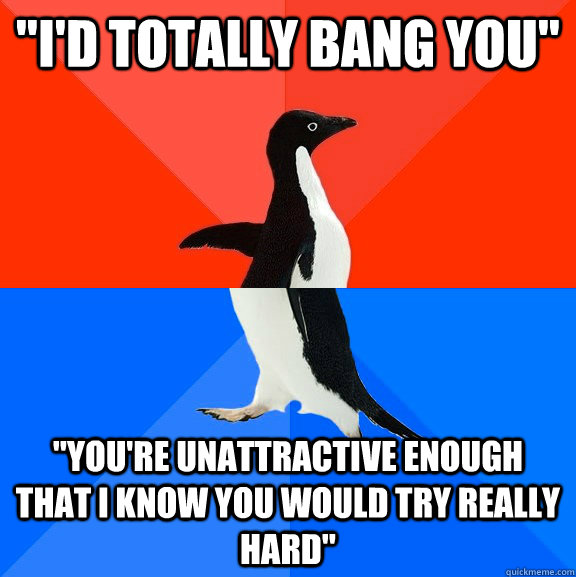 "I'd totally bang you" "You're unattractive enough that I know you would try really hard"