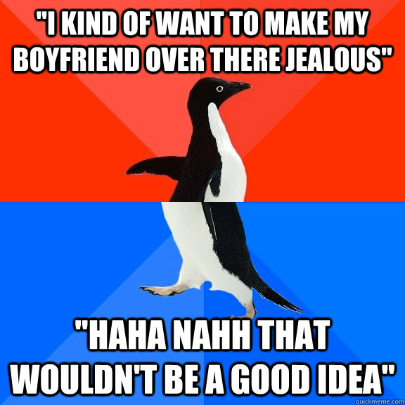 "I kind of want to make my boyfriend over there jealous" "haha nahh that wouldn't be a good idea"