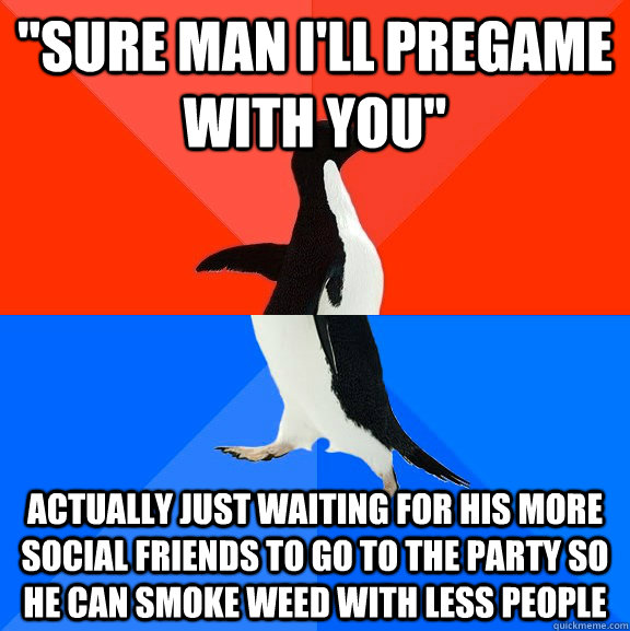 "Sure man I'll pregame with you" Actually just waiting for his more social friends to go to the party so he can smoke weed with less people