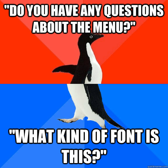 "Do you have any questions about the menu?" "what kind of font is this?"