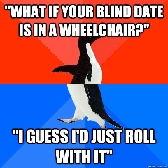 "what if your blind date is in a wheelchair?" "I guess I'd just roll with it"