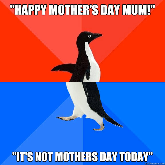 "Happy mother's day mum!" "It's not mothers day today"