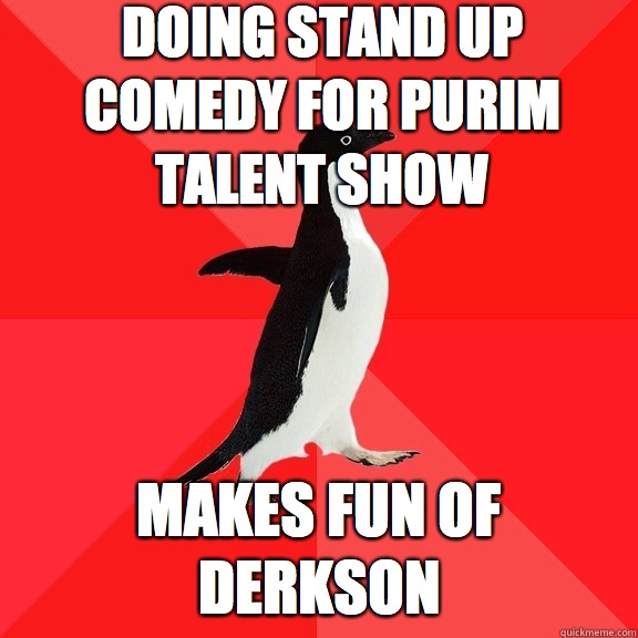 doing stand up comedy for purim talent show makes fun of derkson