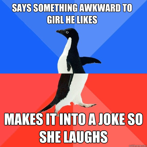 Says something awkward to girl he likes makes it into a joke so she laughs
