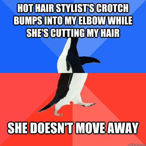Hot Hair Stylist's crotch bumps into my elbow while she's cutting my hair She doesn't move away