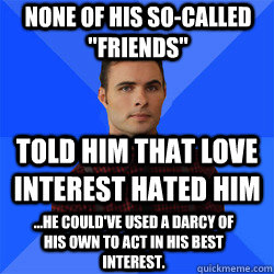 none of his so-called "friends" told him that love interest hated him ...He could've used a Darcy of his own to act in his best interest.