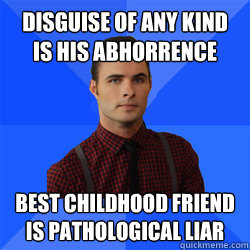 Disguise of any kind is his abhorrence Best childhood friend is pathological liar