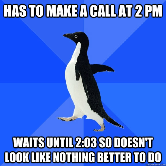 Has to make a call at 2 PM Waits until 2:03 so doesn't look like nothing better to do