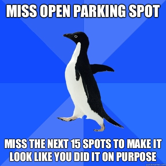 Miss open parking spot Miss the next 15 spots to make it look like you did it on purpose
