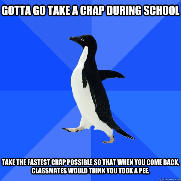 gotta go take a crap during school take the fastest crap possible so that when you come back, classmates would think you took a pee.