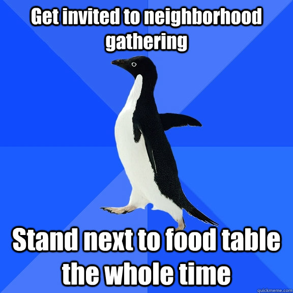 Get invited to neighborhood gathering Stand next to food table the whole time