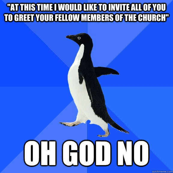 "At this time I would like to invite all of you to greet your fellow members of the church" OH GOD NO