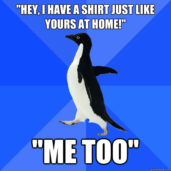 "Hey, I have a shirt just like yours at home!" "Me too"