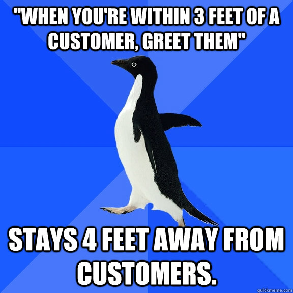 "When you're within 3 feet of a customer, greet them" Stays 4 feet away from customers.