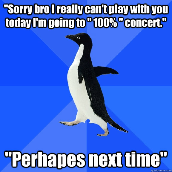 "Sorry bro I really can't play with you today I'm going to " 100% " concert." "Perhapes next time"