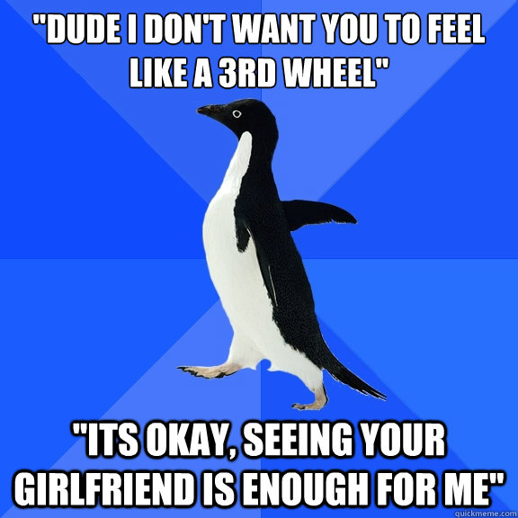 "dude i don't want you to feel like a 3rd wheel" "its okay, seeing your girlfriend is enough for me"