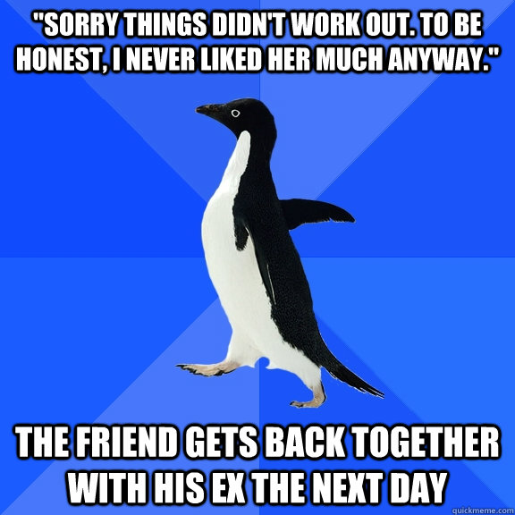 "Sorry things didn't work out. To be honest, I never liked her much anyway." the friend gets back together with his ex the next day