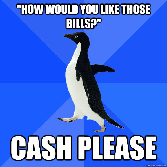 "How would you like those bills?" Cash Please