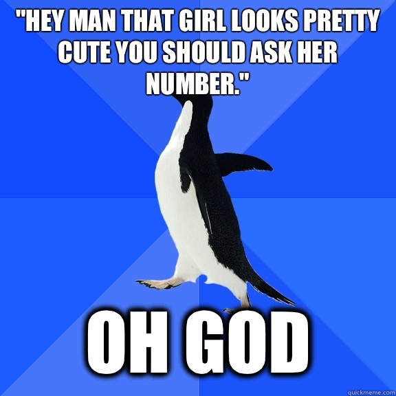 "Hey man that girl looks pretty cute you should ask her number." Oh god