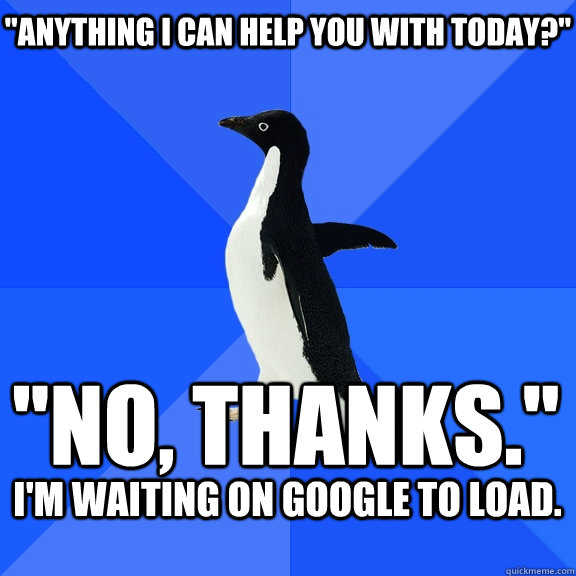 "anything i can help you with today?" "No, thanks." I'm waiting on google to load.