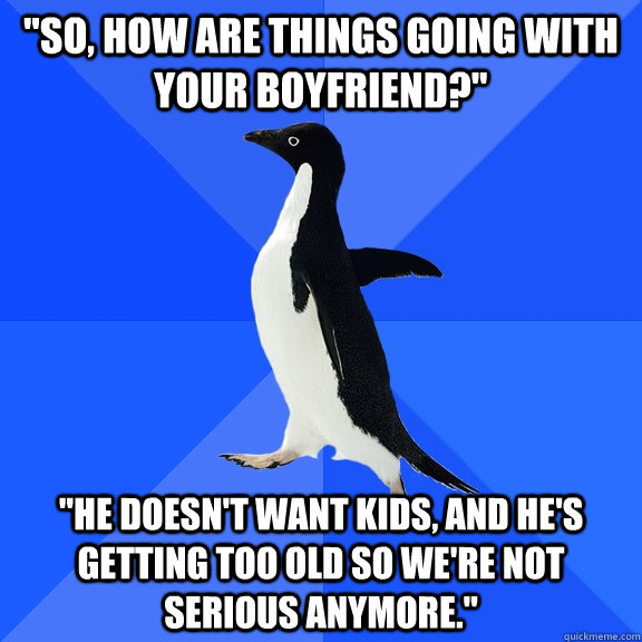 "So, how are things going with your boyfriend?" "He doesn't want kids, and he's getting too old so we're not serious anymore."