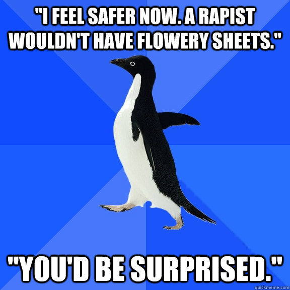 "I feel safer now. A rapist wouldn't have flowery sheets." "You'd be surprised."