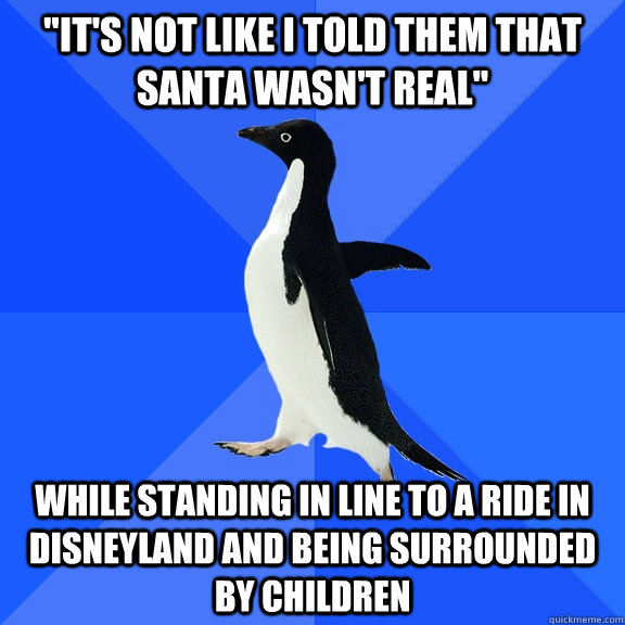 "it's not like i told them that Santa wasn't real" while standing in line to a ride in Disneyland and being surrounded by children
