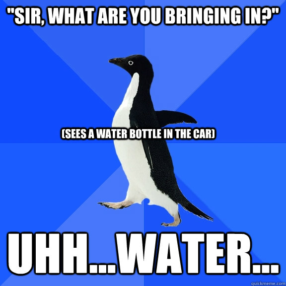 "Sir, what are you bringing in?" uhh...water... (sees a water bottle in the car)