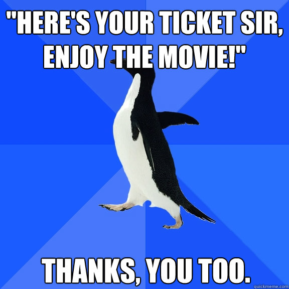 "Here's your ticket sir, enjoy the movie!" Thanks, you too.