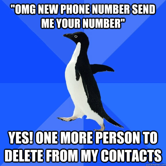 "OMG new phone number send me your number" yes! one more person to delete from my contacts