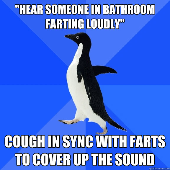"hear someone in bathroom farting loudly" COUGH IN SYNC WITH FARTS TO COVER UP THE SOUND