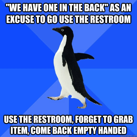 "we have one in the back" as an excuse to go use the restroom use the restroom, forget to grab item, come back empty handed