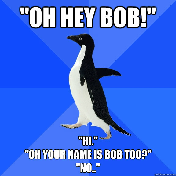"Oh hey bob!" "Hi." "oh your name is bob too?" "No.."
