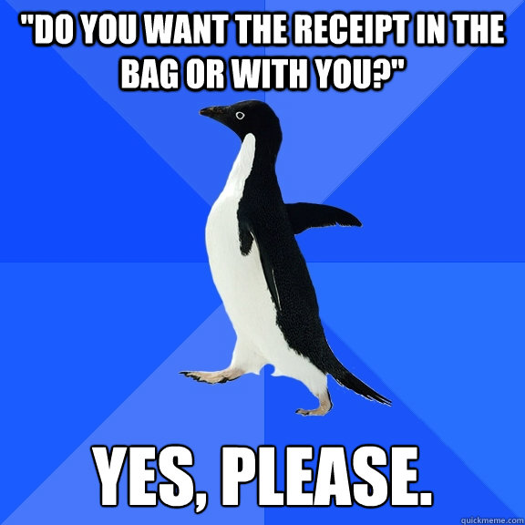 "Do you want the receipt in the bag or with you?" Yes, please.