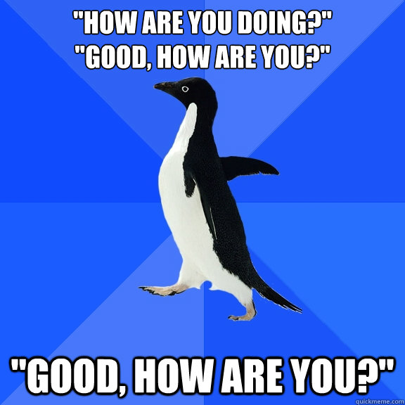 "How are you doing?" "Good, how are you?" "Good, how are you?"