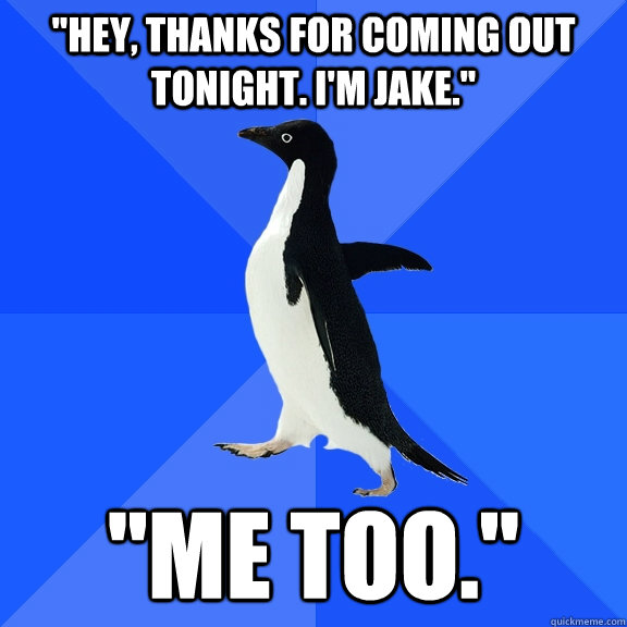 "Hey, thanks for coming out tonight. I'm Jake." "Me too."