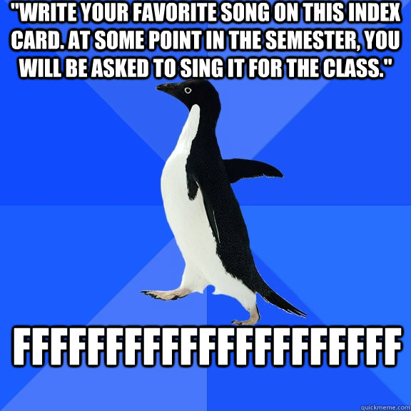 "Write your favorite song on this index card. At some point in the semester, you will be asked to sing it for the class." FFFFFFFFFFFFFFFFFFFFF