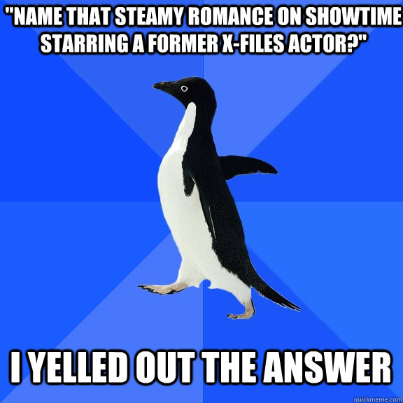 "Name that steamy Romance on Showtime starring a former x-files actor?" I yelled out the answer