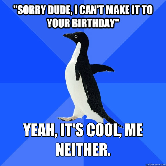 "Sorry dude, i Can't make it to your birthday" Yeah, it's cool, me neither.
