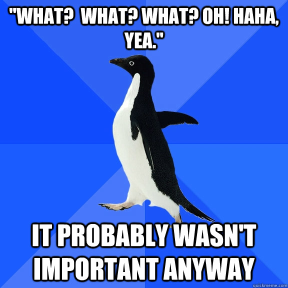 "What? What? what? Oh! hAHA, YEA." It probably wasn't important anyway