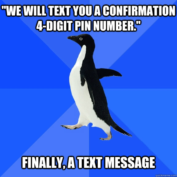 "We will text you a confirmation 4-Digit PIN Number." finally, a text message