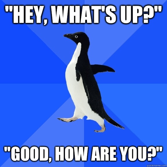 "Hey, what's up?" "Good, how are you?"